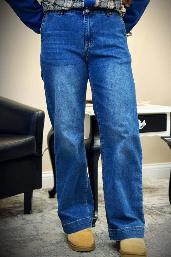 You belong in these dark blue straight leg jeans that will hug you in all the right places!