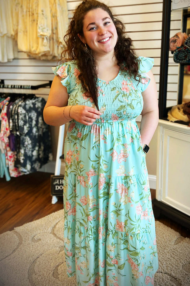 You'll be feeling this vibe in this gorgeous sage and floral smocked maxi dress!