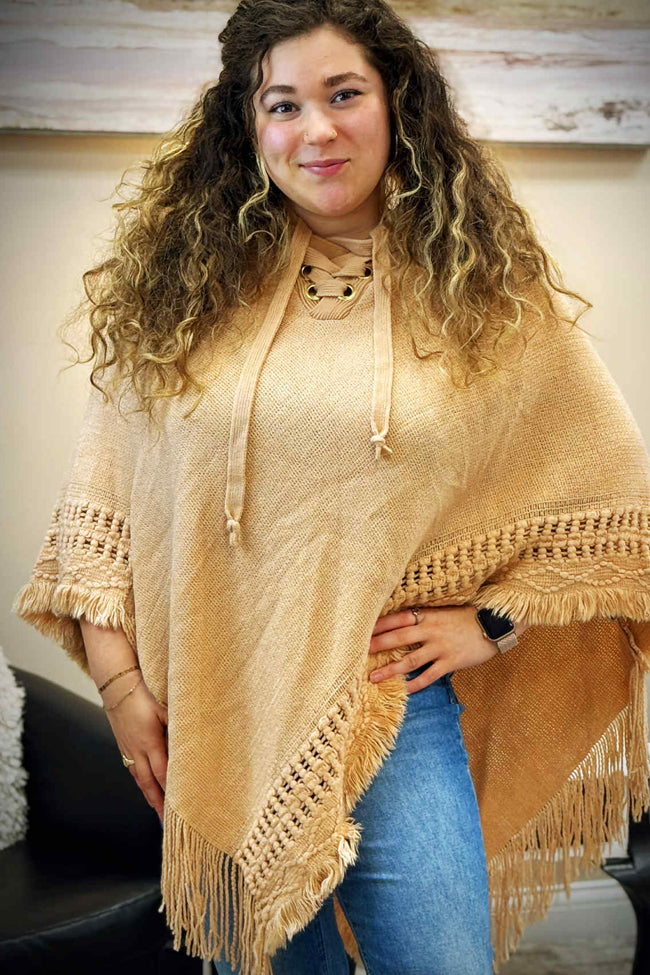 Everything will always go your way if you are wearing this FABulous beigy-pink fringe poncho! You will love the lace up detail on the front and the super cozy feel. Fit is one size fits most.