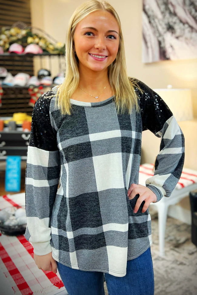This adorable sequin and black checkered long sleeve top will be there for you!