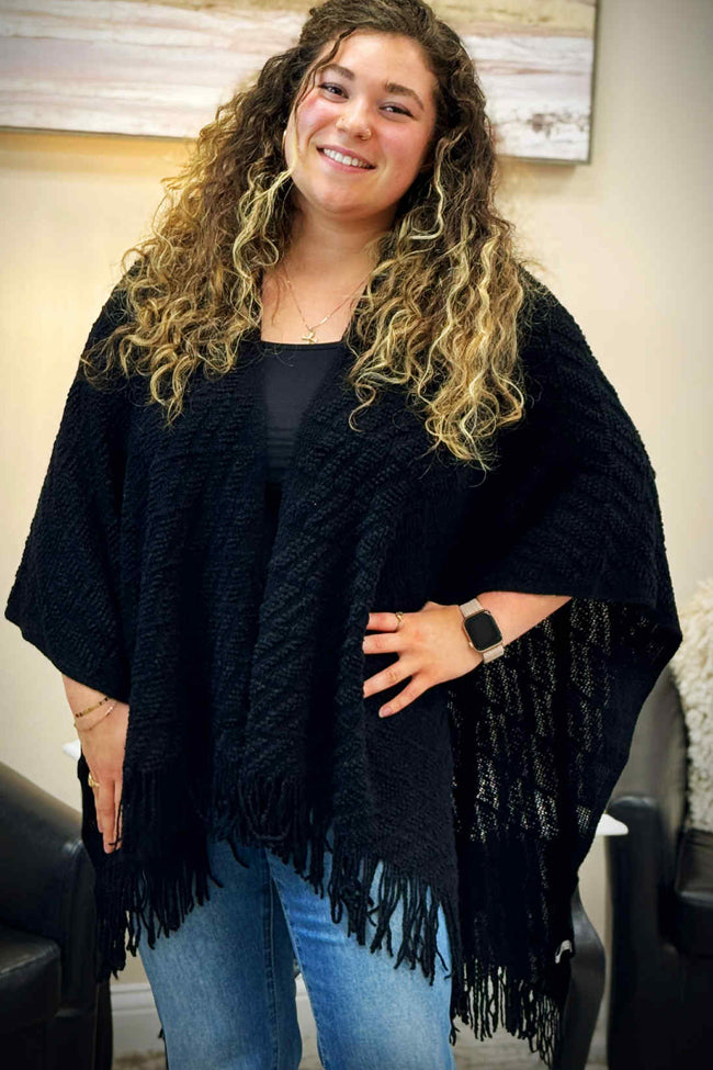 This gorgeous black tassel poncho is just what you need! It's so versatile and will easily take you from season to season. Fit is one size fits most.
