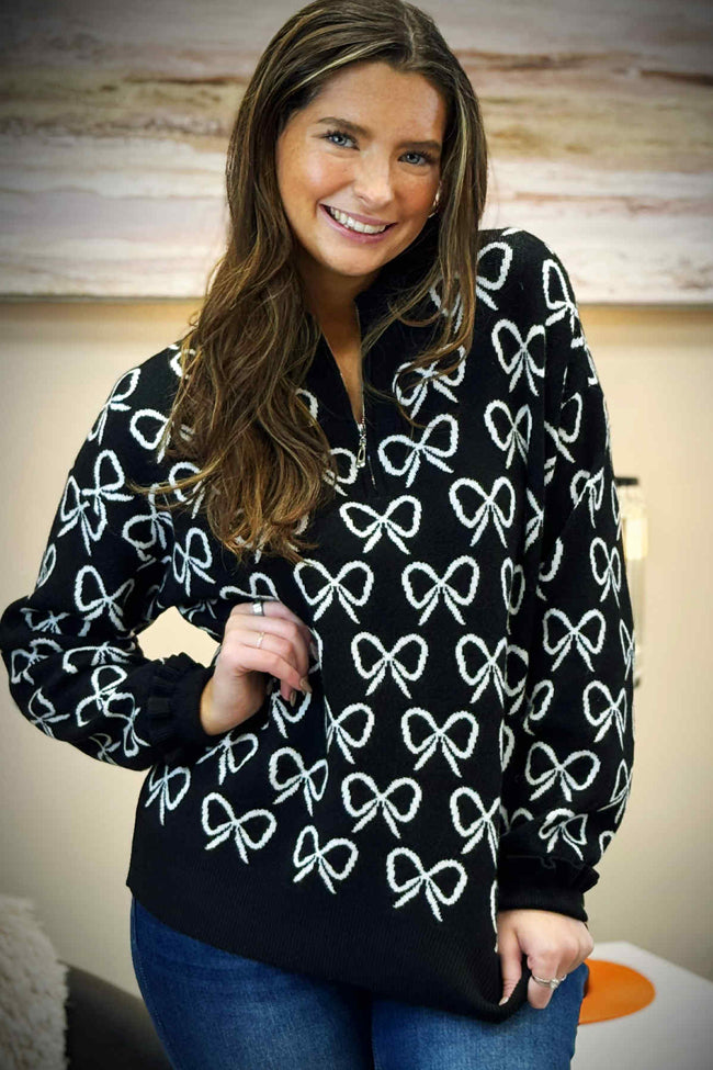 There will be no holding back in this gorgeous black bow sweater! This one is so cozy and features a classic fit. Model in picture is wearing a medium.
