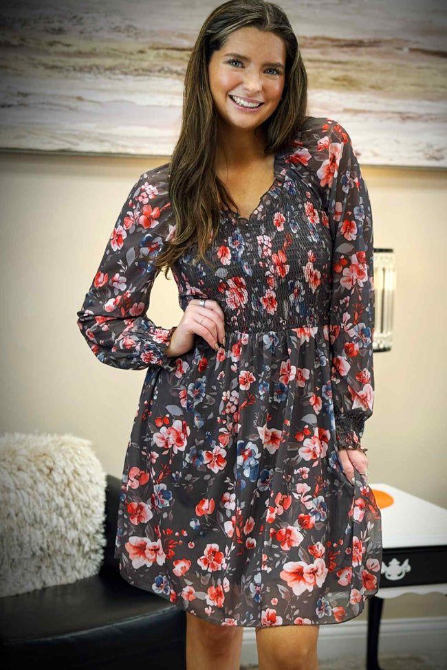You'll give your heart to this gray floral frill dress! This dress is absolutely amazing, the fabric is silky soft, and the fit is perfect. Model in picture is wearing a medium.