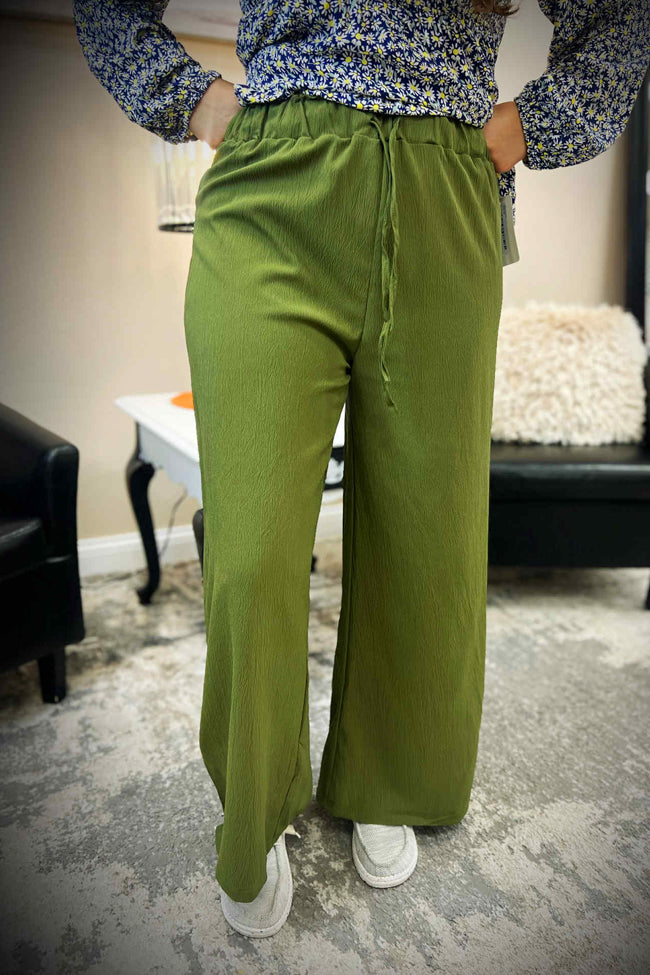 You'll certainly get your love-on in these amazing olive tie dress pants. They are so comfy! Fit is true to size, model in picture is wearing a medium.