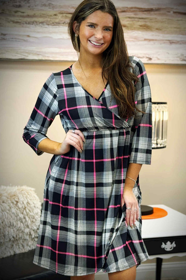 Let me know when you are ready to put on this adorable dress for a night out! This plaid dress is so comfy! The fabric is silky soft and lays perfectly. Fit is true to size, model in picture is wearing a medium.