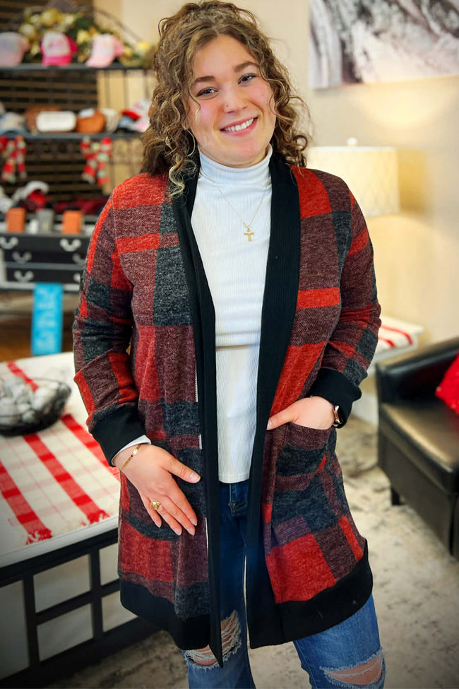 Every now and then you find the most comfortable cardigan and this is it right here! This red and black cardigan features a muted color pattern and cozy material. Fit is true to size, model in picture is wearing a large.