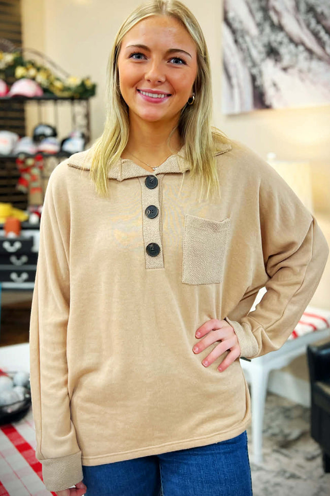 You are sure to be on your way in this adorable taupe dolman sleeve top! It's perfect with dark jeans or slacks. Fit is true to size, model in picture is wearing a small.