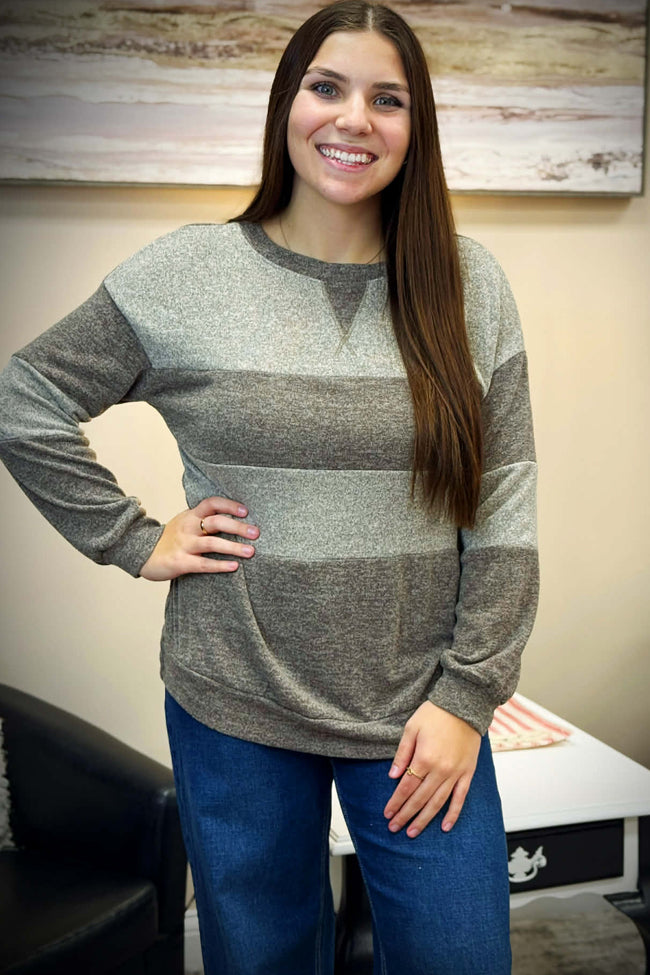 Feel this way every day! You'll be feeling amazing in this taupe V-neck color block long sleeve!