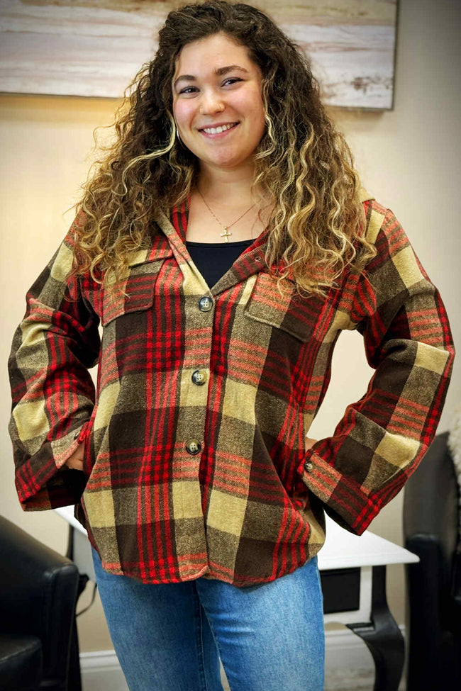 Let's get to it....this red plaid hooded shacket must go home with you! It's so cozy and the colors are on-point for this time of year. Fit is true to size, model in picture is wearing a large.
