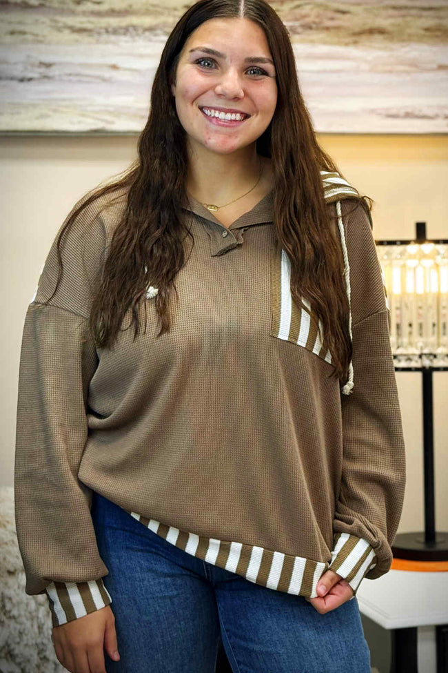 All of your friends are sure to say OMG if you are wearing this amazing brown waffle hoodie! This hoodie features a classic fit and stripe detail. Fit is true to size, model in picture is wearing a large.