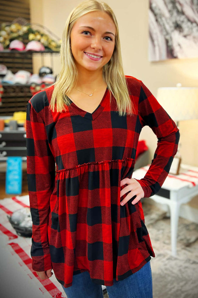 You can have a holly jolly good time in this buffalo plaid v-neck long sleeve top!