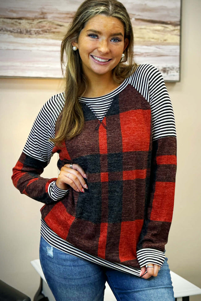 You'll be just jolly in this adorable buffalo plaid and stripe top! It's so comfy and fits perfectly. Model in picture is wearing a medium.