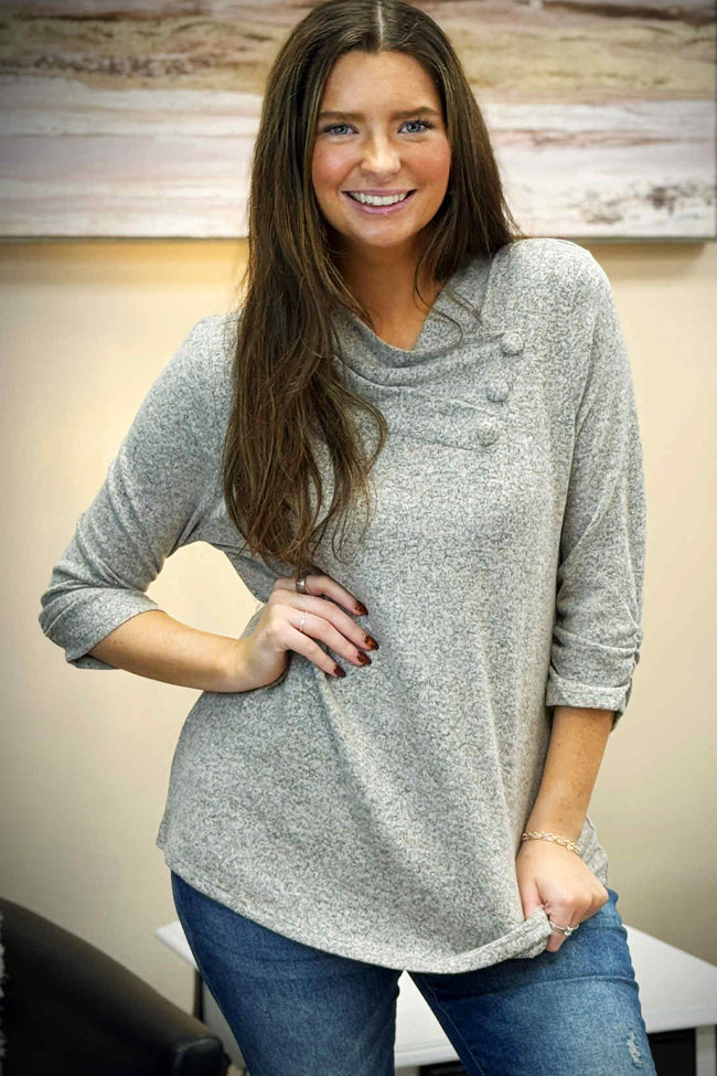 Take a chance on this gorgeous heathered taupe top! This one features a neckline button detail and a 3/4 sleeve. Fit is true to size, model in picture is wearing a medium.