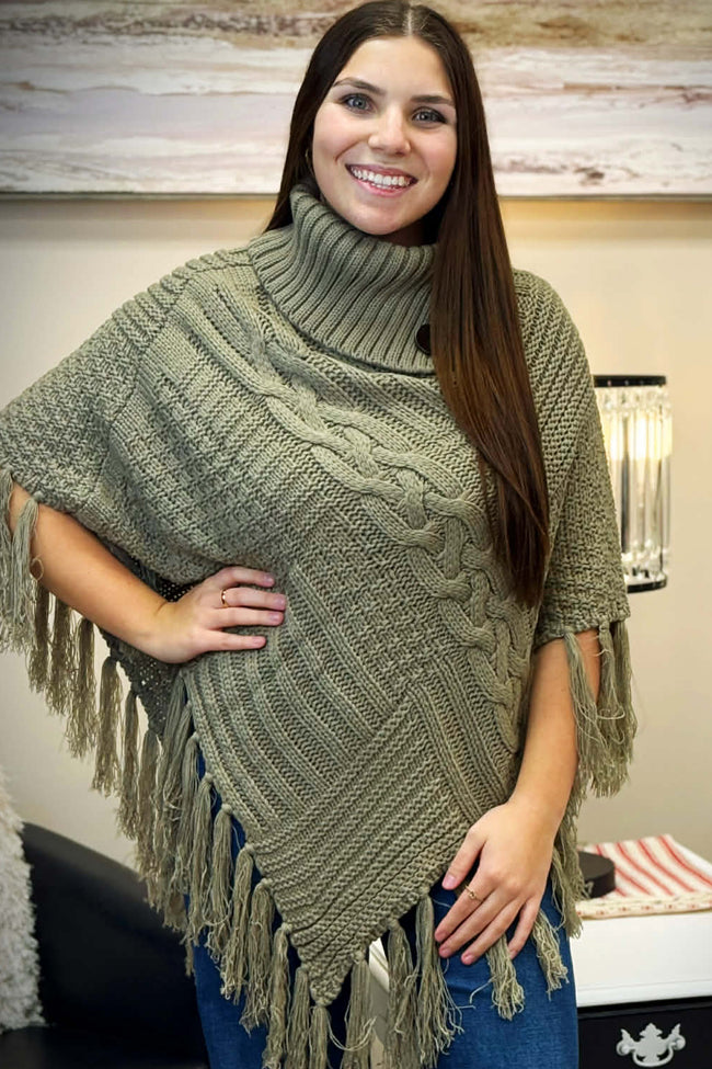 Get to know yourself in this FABulous mocha cable tassel poncho!