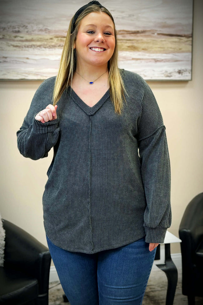 Time after time you'll hear compliments while wearing this perfect charcoal ribbed v-neck top!