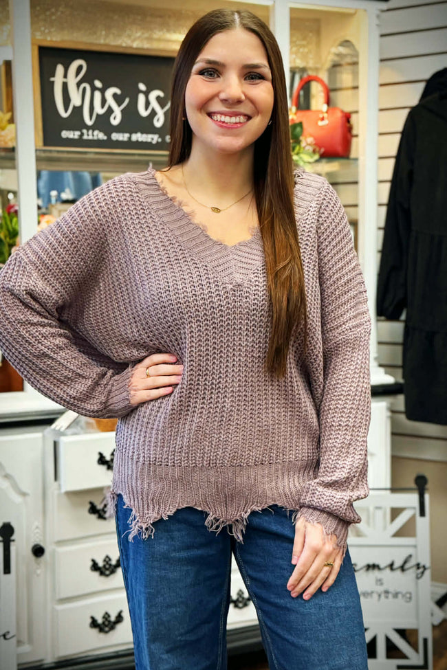 Wearing this FABulous cozy, ash purple, distressed sweater will definitely make your day!