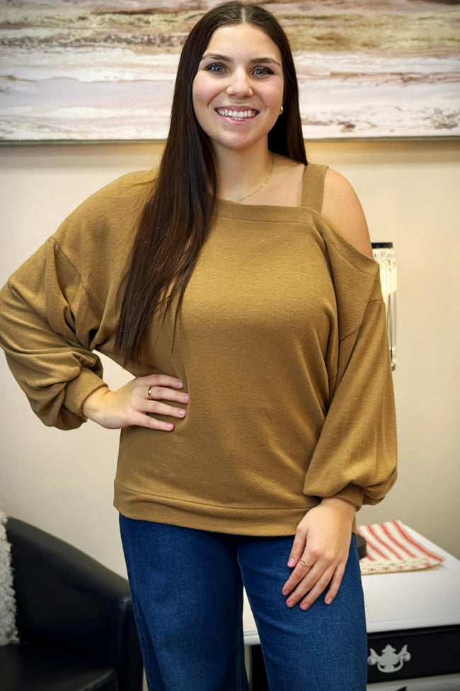 You'll remember when you purchased this camel off the shoulder long sleeve top!
