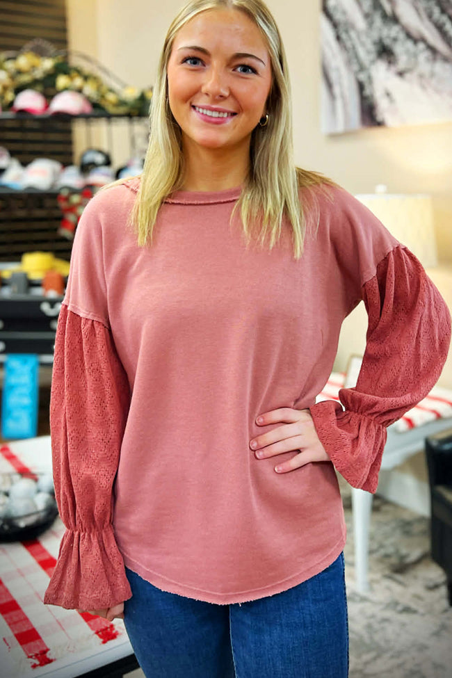 You really need to know about this fabulous top! This dark mauve top features a classic fit and an adorable ruffle cuff. You will love it! Model in picture is wearing a small.