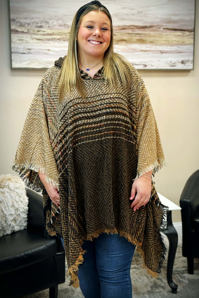 People will want to stay close to you while you're wearing this adorable mocha striped poncho!