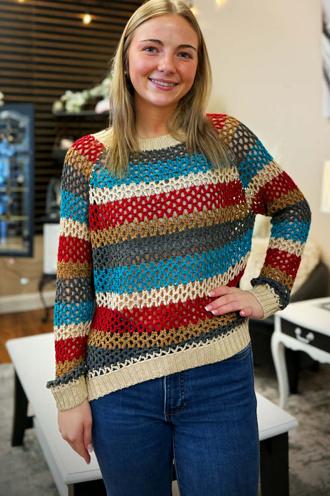 Everyone will remember you wearing this flawless multi. color crochet knit long sleeve top!
