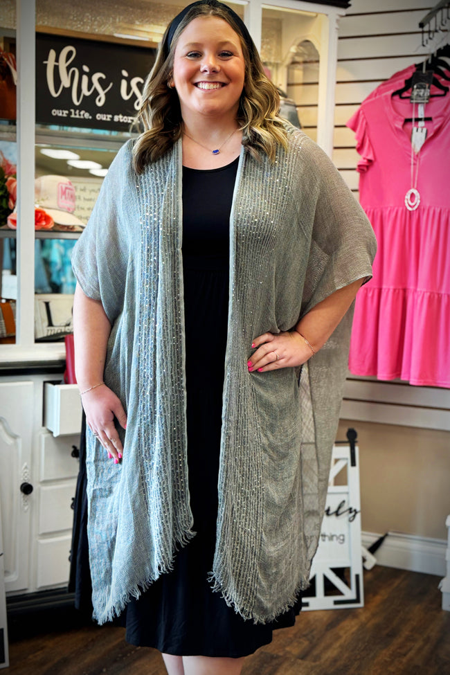 You'll be wondering why you haven't had this amazing gray sparkle kimono all this time! It will have you feeling as confident as ever!